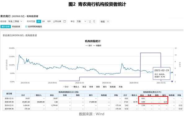 》分析道。然而,就目前而言,青農(nóng)商行的機(jī)構(gòu)投資者持股占比幾乎為零,其中銀行在第三季度報(bào)表中持有的6.31%股份,也已經(jīng)在2020年第四季度“清倉”(見圖2)。