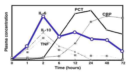 機體炎癥反應(yīng)發(fā)生后 IL-6 率先生成 ,之后誘導(dǎo) CRP 和降鈣素原( PCT )生成。研究顯示,細(xì)菌感染后 IL-6 迅速升高, PCT 在 2h 后增加,而 CRP 在 6h 后才迅速增加 [1] 。