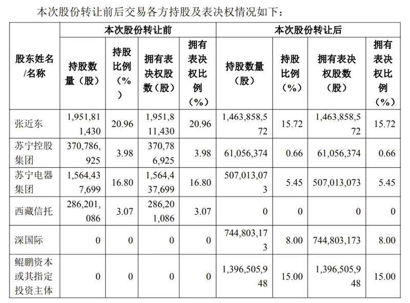 交易實施完畢后,上市公司原控股股東、實際控制人張近東及其一致行動人蘇寧控股集團持股比例為 16.38%,蘇寧電器集團持股比例為 5.45%,張近東仍為第一大表決權股東。