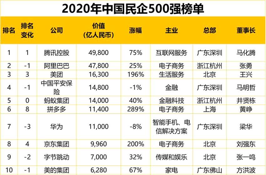 圖:2020中國(guó)500強(qiáng)民營(yíng)企業(yè)榜單(節(jié)選)