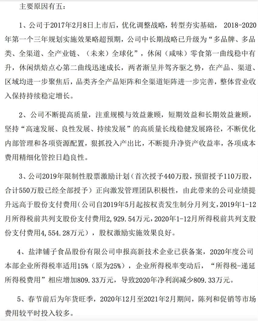 其一,業(yè)績快報顯示,鹽津鋪子2019年限制性股票激勵計劃(首次授予440萬股,預(yù)留授予110萬股, 合計550萬股已經(jīng)全部授予)正向激發(fā)管理團(tuán)隊積極性,由此帶來的公司業(yè)績提升金額遠(yuǎn)高于股份支付費用(公司自2019年5月起按權(quán)責(zé)發(fā)生制分月列支,2019年1月2 月所得稅前共列支股份支付費用2929.54萬元,2020年1月-12月所得稅前共列支股份支付費用4554.28萬元)。