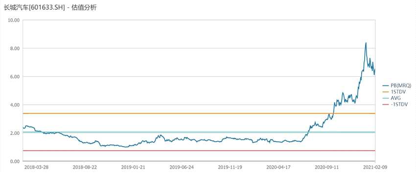 再看估值稍微低一些的長城汽車,該公司在2020年之前的PE(市盈率)基本上都是在25倍以下,而去年最高到達100多倍,目前市盈率仍有60多倍。從PB(市凈率)來看,長城汽車2020年之前的市凈率基本上是1倍多,而去年最高超過8倍,目前市凈率仍有6倍。