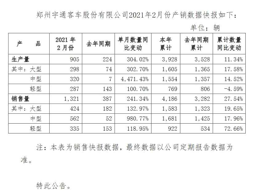 摘要: 宇通客車(600066)公告,2月客車銷售量1321輛,同比增長241.34%;1-2月累計銷售4186輛,同比增長27.54%。
