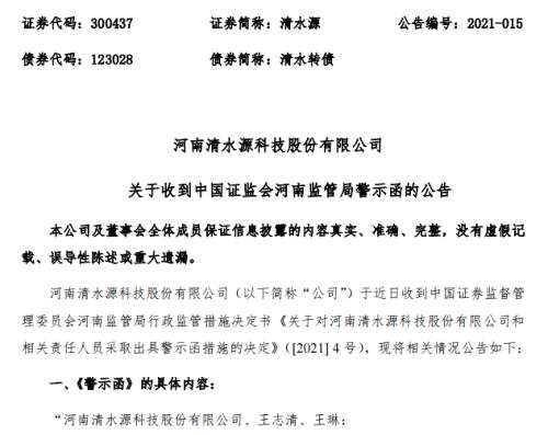 根據(jù)《上市公司信息披露管理辦法》(證監(jiān)會令第40號)第五十八條、第五十九條的規(guī)定,河南證監(jiān)局決定對清水源及王志清、王琳采取出具警示函的監(jiān)管措施,并記入證券期貨市場誠信檔案。