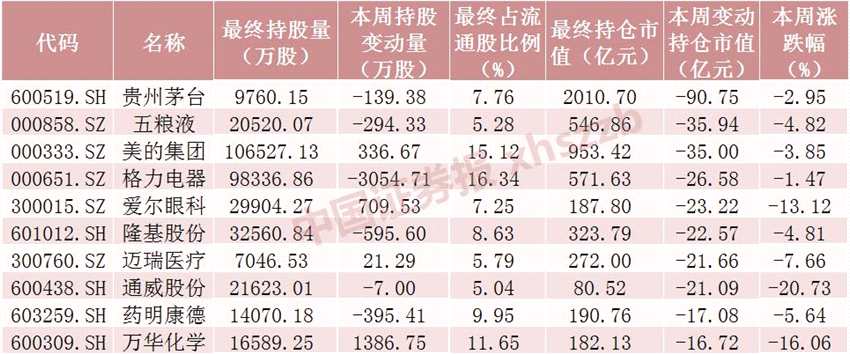 本周北向資金持倉(cāng)市值減少額居前十個(gè)股