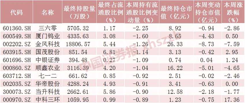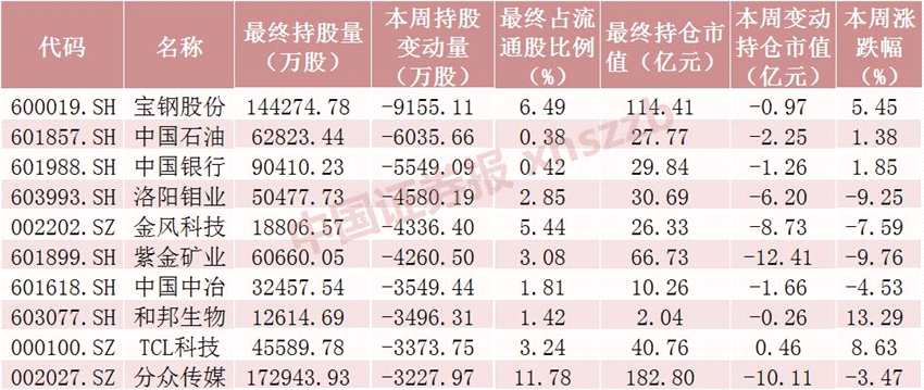本周北向資金減倉(cāng)股數(shù)居前十個(gè)股