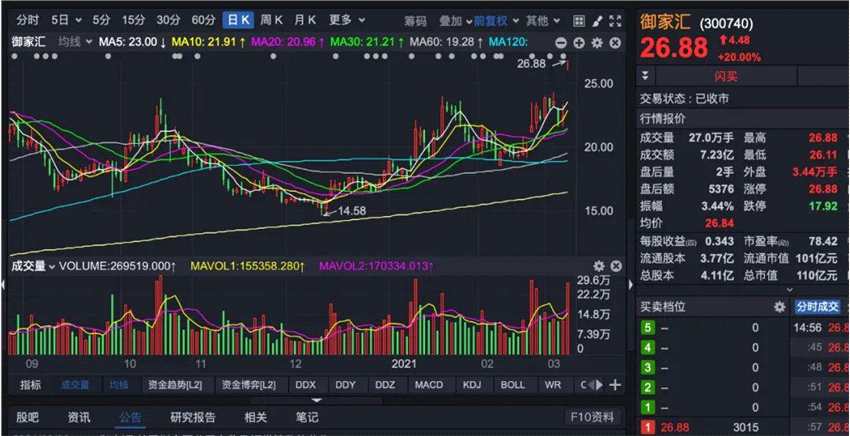3月8日,御家匯以20%漲停開盤,中間幾度打開漲停,最終全天收于26.88元/股的漲停之位,成交額7.23億元。
