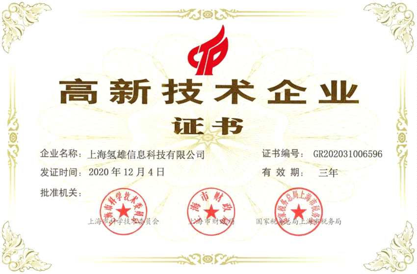 上海氫雄正式取得高新技術(shù)企業(yè)證書(shū)