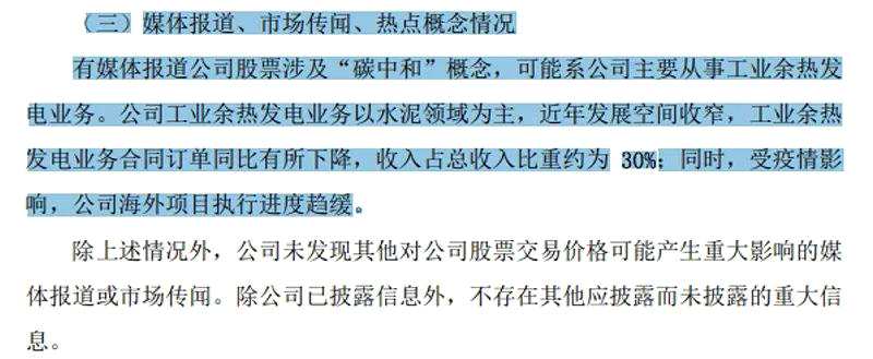 中材節(jié)能在公告中表示,有媒體報道公司股票涉及“碳中和概念”,可能系公司主要從事工業(yè)余熱發(fā)電業(yè)務。