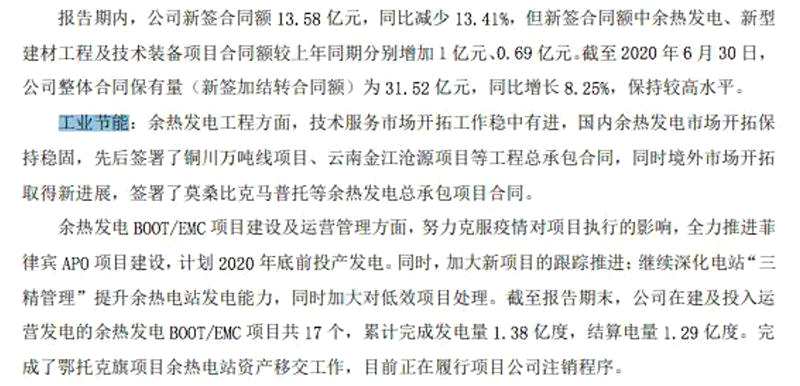 那么,這部分業(yè)務規(guī)模究竟有多大呢?中材節(jié)能2020年半年報顯示,2020年上半年,公司新簽合同額中余熱發(fā)電項目同比增加1億元。工業(yè)節(jié)能方面,余熱發(fā)電工程方面,國內(nèi)余熱發(fā)電市場開拓保持穩(wěn)固,先后簽署了銅川萬噸線項目、云南金江滄源項目等工程總承包合同。同時,境外市場開拓取得新進展,簽署了莫桑比克馬普托等余熱發(fā)電總承包項目合同。余熱發(fā)電BOOT/EMC項目建設及運營管理方面,公司在建及投入運營發(fā)電的余熱發(fā)電BOOT/EMC項目共17個,累計完成發(fā)電量1.38億度,結(jié)算電量1.29億度。