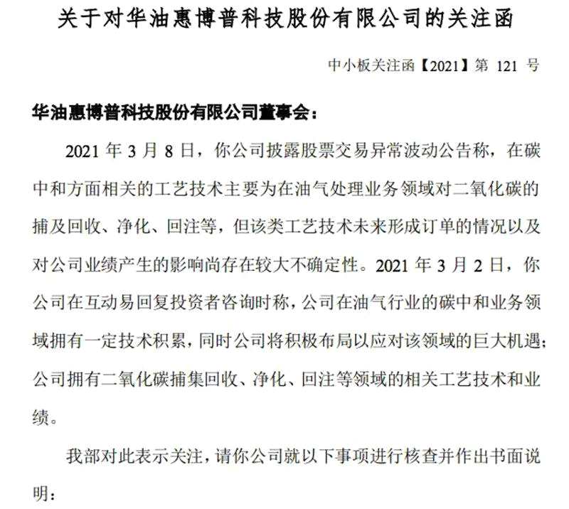 如三連板的惠博普(002554)在3月8日晚間收到深交所關(guān)注函,要求公司說明在碳中和業(yè)務方面的研發(fā)投入、研發(fā)進度、無形資產(chǎn)、專利技術(shù)、核心技術(shù)人員情況,相關(guān)工藝技術(shù)形成的產(chǎn)品或服務的具體情況,目前是否已形成訂單及相關(guān)訂單對營業(yè)收入和利潤的影響,說明公司自稱有一定技術(shù)積累和業(yè)績的詳細原因及其合理性,是否存在“蹭熱點”炒作股價的情形。
