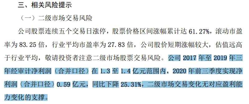 公司曾在稍早前的股票異動公告中披露,2017年至2019年三年經(jīng)審計凈利潤(合并口徑)在1.3億元至1.4億元范圍內(nèi),2020年前三季度實現(xiàn)凈利潤(合并口徑)0.59億元,同比下降25.31%,二級市場交易變化無對應盈利能力變化的支撐。