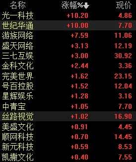 3月11日,云游戲板塊拉升,截至發(fā)稿,世紀華通(002602)漲停,光一科技(300356)漲超10%,【游族網(wǎng)絡(luò)(002174)、股吧】(002174)漲超7%,盛天網(wǎng)絡(luò)(300494)、三七互娛(002555)、金科文化(300459)等跟漲。
