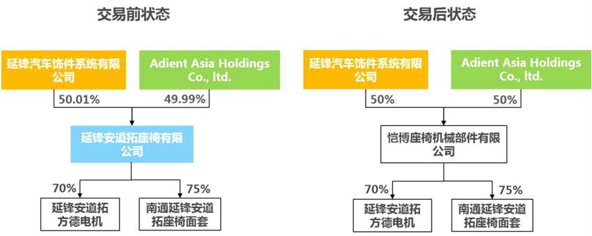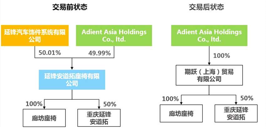 交易二:延鋒安道拓所持有的重慶延鋒安道拓汽車部件系統(tǒng)有限公司(以下簡稱:重慶延鋒安道拓)50%股權和延鋒安道拓(廊坊)座椅有限公司(以下簡稱:廊坊座椅)100%股權擬轉讓給安道拓之全資子公司期躍(上海)貿易有限公司,上述股權對應轉讓價格分別為166,815萬元人民幣和8,580萬元人民幣。該交易完成后,延鋒安道拓將不再持有重慶延鋒安道拓和廊坊座椅的股權,重慶延鋒安道拓和廊坊座椅將不再納入華域汽車并表范圍,該變化對華域汽車整體銷售收入和盈利水平的影響較小。