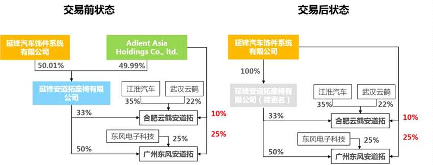 交易四:延鋒公司和愷博座椅擬分別收購安道拓亞太直接持有的延鋒安道拓下屬三家企業(yè)的少數股東股權:廣州東風安道拓座椅有限公司25%股權(以下簡稱:廣州東風安道拓)、合肥云鶴安道拓汽車座椅有限公司10%股權(以下簡稱:合肥云鶴安道拓)以及南通延鋒安道拓座椅面套有限公司25%股權。其中,延鋒公司擬分別以37,100萬元人民幣和1,320萬元人民幣的對應價格收購廣州東風安道拓25%股權和合肥云鶴安道拓10%股權;愷博座椅擬以3,768萬元人民幣的對應價格收購南通面套25%股權。該交易完成后,延鋒公司和延鋒安道拓將合計持有廣州東風安道拓75%股權、合肥云鶴安道拓43%股權;愷博座椅將持有南通面套100%股權。
