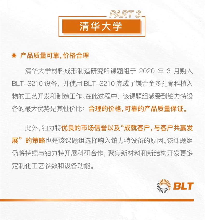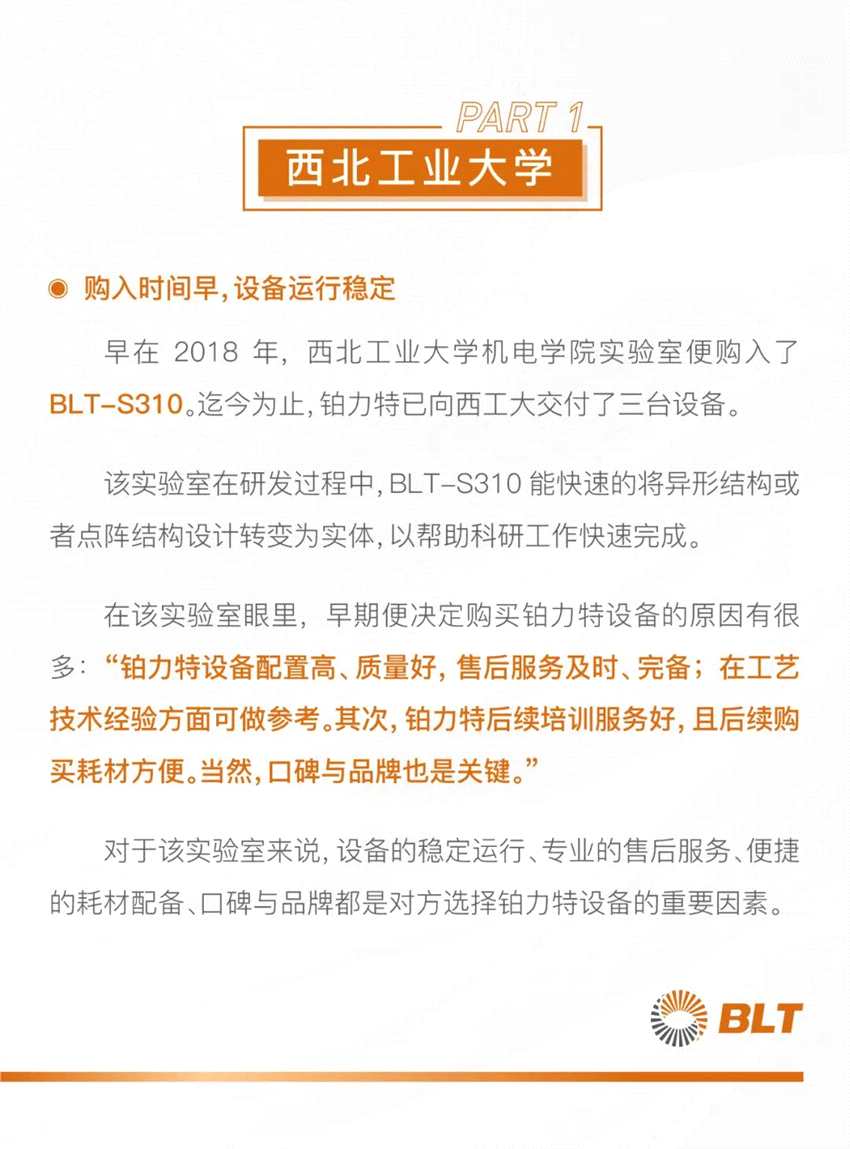 鉑力特共向高校用戶交付 39臺 鉑力特金屬3D打印設(shè)備,深度合作用戶包括清華大學(xué)、浙江大學(xué)、上海交通大學(xué)、華中科技大學(xué)、吉林大學(xué)、暨南大學(xué)、湖南大學(xué)、西北工業(yè)大學(xué)、北京科技大學(xué)、南京工業(yè)大學(xué)、河北工業(yè)大學(xué)、寧波諾丁漢大學(xué)、吉林大學(xué)、山東大學(xué)、長沙理工大學(xué)、西安理工大學(xué)、西安工業(yè)大學(xué)等。鉑力特的設(shè)備和科研能力廣受高校用戶好評。
