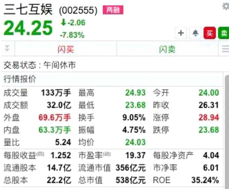 雖然此前【世紀(jì)華通(002602)、股吧】(002602)表示,騰訊大手筆增持,但是并未給游戲股帶來重生的希望。今日早盤,三七互娛(002555)繼上一交易日跌停后繼續(xù)大跌近8%,報(bào)24.24元/股,較2020年7月時(shí)的50.7元高位已腰斬,彼時(shí)總市值也曾超過1000億元,如今只有538億元。