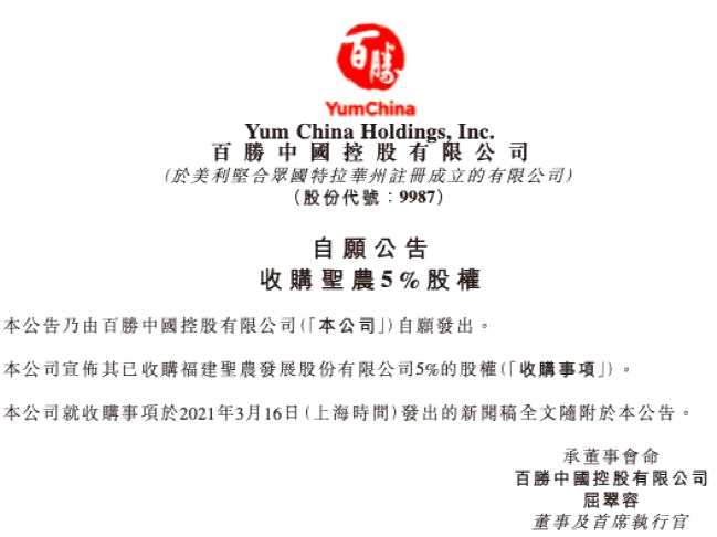3月16日晚間,“白羽肉雞龍頭”圣農(nóng)發(fā)展(002299)公告表示,獲百勝中國(guó)子公司舉牌,增持公司股份達(dá)到5%。同時(shí),百勝中國(guó)也發(fā)布了相關(guān)收購(gòu)公告。