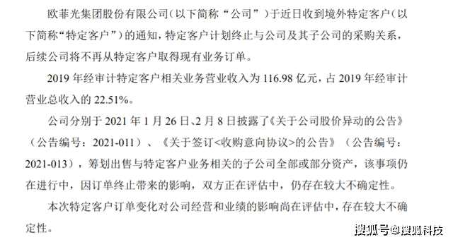摘要: 出品|搜狐科技編輯|張雅婷3月16日消息,歐菲光(002456)發(fā)布公告稱,公司近日收到境外特定客戶的通知,特定客戶計(jì)劃終止與公司及其子公司的采購關(guān)系,后續(xù)公司將不再從特定客戶取得現(xiàn)有業(yè)務(wù)訂單。