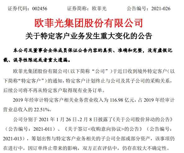 16日晚,深交所中小板公司管理部發(fā)布關注函,要求歐菲光補充披露境外特定客戶計劃終止采購關系的時間、目前與該特定客戶相關的訂單情況;評估境外特定客戶終止采購關系事項對公司財務狀況的影響;對于前期已披露《2020年度業(yè)績預告》、《2020年度業(yè)績快報》,如涉及業(yè)績預告、快報修正,要求歐菲光及時修正等。
