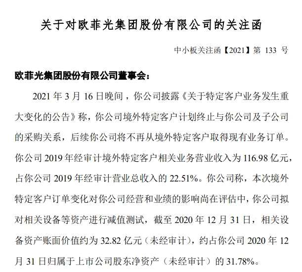 換言之,歐菲光的這一紙公告,此前五分之一的總收入都可能受到影響,自然很快收到了深交所的關注函。