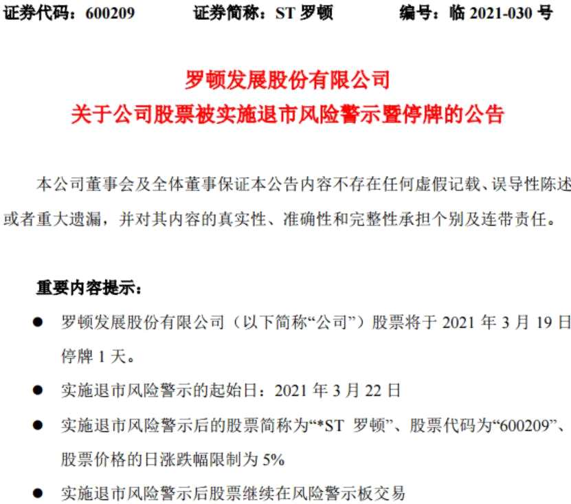 摘要: 3月18日晚間,ST羅頓(600209)發(fā)布公告稱,公司2020年度凈利潤為負(fù)值且營業(yè)收入低于1億元,將被實(shí)施退市風(fēng)險(xiǎn)警示,股票簡稱為“*ST羅頓”。公司股票將于3月19日停牌一天,3月22日復(fù)牌。