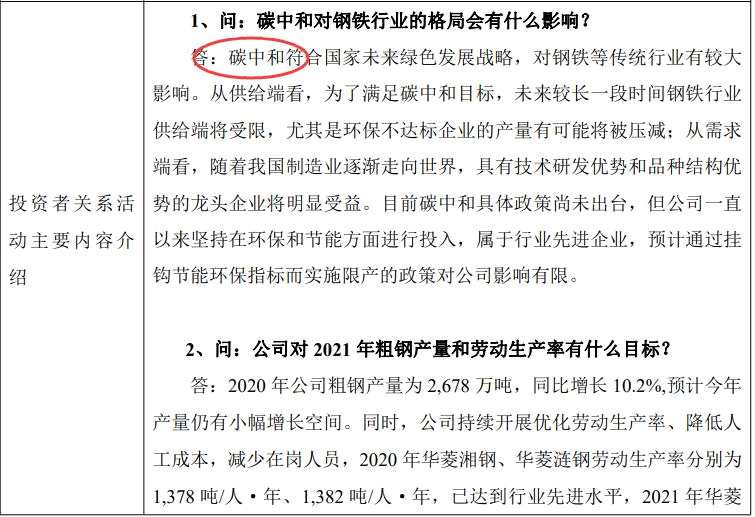 從調(diào)研記錄來看,鋼材價格走勢,公司訂單與庫存,行業(yè)并購與競爭關(guān)系都受到機構(gòu)調(diào)研關(guān)注。值得一提的是,在調(diào)研中,“碳中和”議題也成為機構(gòu)關(guān)注焦點。