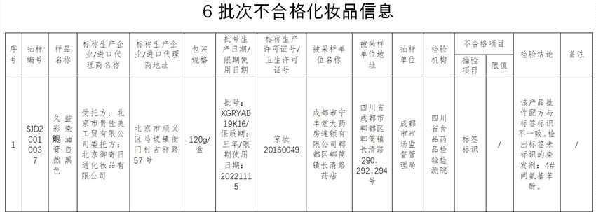其中,由北京御奇日通化妝品有限公司委托北京市貴佳美工貿(mào)有限公司生產(chǎn)的久益彩染焗油膏(自然黑色)抽驗(yàn)顯示標(biāo)簽標(biāo)識(shí)項(xiàng)目不合格,抽樣單位為成都市市場(chǎng)監(jiān)督管理局,檢驗(yàn)機(jī)構(gòu)為四川省食品藥品檢驗(yàn)檢測(cè)院,檢驗(yàn)結(jié)論為該產(chǎn)品批件配方與標(biāo)簽標(biāo)識(shí)不一致。檢出標(biāo)簽未標(biāo)識(shí)的染發(fā)劑:4#間氨基苯酚。
