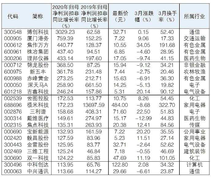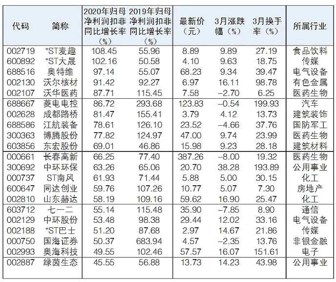 扣非凈利潤(rùn)是扣除剔除非經(jīng)常性的損益項(xiàng)目。根據(jù)Wind數(shù)據(jù)統(tǒng)計(jì),截至昨日,已有303家公司披露2020年年報(bào)。這其中有43家公司2019年和2020年扣非歸母凈利同比增速超45%。