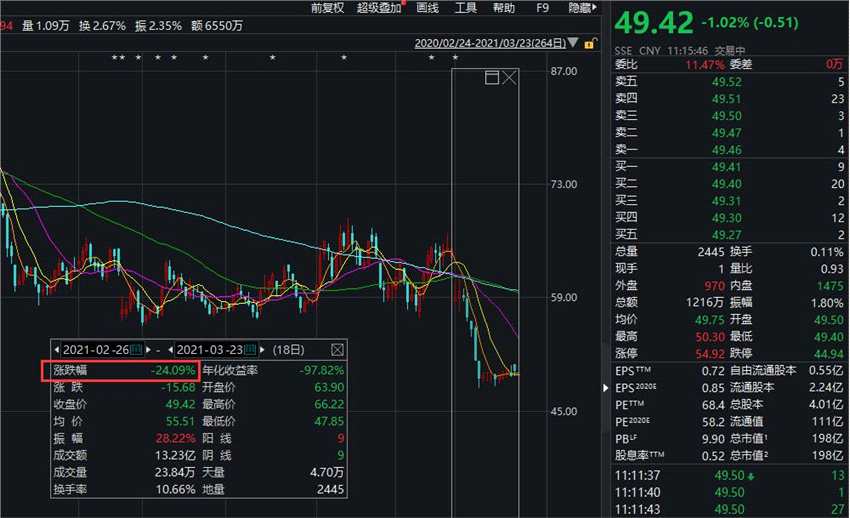 良品鋪?zhàn)拥墓蓛r(jià)也一路走低。截至今日午間收盤(pán),良品鋪?zhàn)訄?bào)收48.98元,較去年的高位下跌了44%,總市值蒸發(fā)了近120億元。