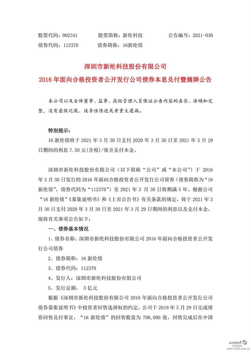 3月27日,深圳市新綸科技(002341)股份有限公司發(fā)布關(guān)于2016年公開發(fā)行公司債券(第五期)2021年本息兌付及摘牌公告。公告顯示新綸科技將于2021年3月30日向合格投資者支付2020年3 月30日至2021年3月29日期間的最后一個年度利息和該期債券本金,完成“16新綸債”(債券代碼為“112370”)公開發(fā)行公司3億債券第五個會計年度的利息和本金兌付工作。公告如下: