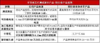 根據(jù)招股書(shū)披露的主要在研項(xiàng)目顯示,公司當(dāng)前12項(xiàng)主要在研項(xiàng)目中,有2項(xiàng)已進(jìn)入終試轉(zhuǎn)量產(chǎn)階段,其中一項(xiàng)“5G時(shí)代高頻測(cè)試用沖壓探針研發(fā)”產(chǎn)品可測(cè)試高功率大電流的芯片,預(yù)期可實(shí)現(xiàn)在30GHz射頻信號(hào)工作環(huán)境下的插損在dB以內(nèi),而國(guó)內(nèi)平均水平約為10GHz@-1dB;此外,該產(chǎn)品預(yù)期使用壽命較同類產(chǎn)品提高20%左右。預(yù)計(jì)推出后將成為公司又一大產(chǎn)品利器。