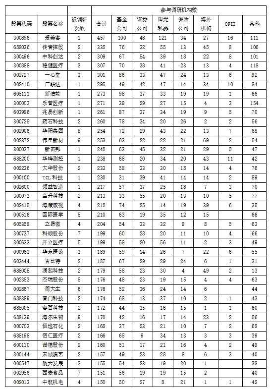 此外,傳音控股(行情688036,診股)、中科創(chuàng)達(行情300496,診股)、穩(wěn)健醫(yī)療(行情300888,診股)、一心堂(行情002727,診股)、新潔能(行情605111,診股)、樂普醫(yī)療(行情300003,診股)、兆易創(chuàng)新(行情603986,診股)、華陽集團(行情002906,診股)、偉星新材(行情002372,診股)、新宙邦(行情300037,診股)、華峰測控(行情688200,診股)、大華股份(行情002236,診股)、TCL科技(行情000100,診股)、領(lǐng)益智造(行情002600,診股)、當升科技(行情300073,診股)、??低?行情002415,診股)、國際醫(yī)學(xué)(行情000516,診股)、立昂微(行情605358,診股)、【科順股份(300737)、股吧】(行情300737,診股)等也接受超過200家機構(gòu)的調(diào)研。