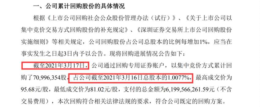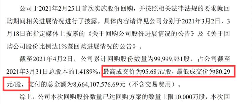 而27個(gè)交易日內(nèi)斥資87億回購(gòu)1.4%股份,相當(dāng)于每天平均回購(gòu)3.22億。