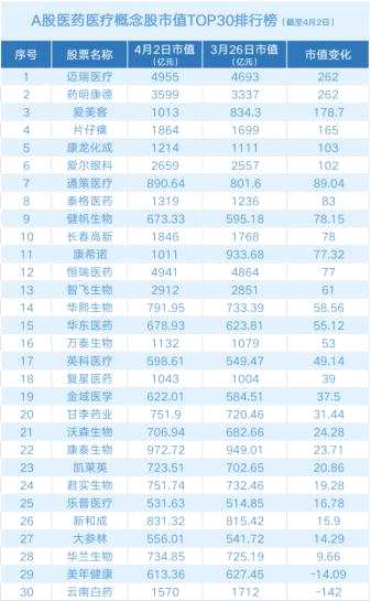 在A股醫(yī)藥醫(yī)療概念股市值TOP30的榜單中,僅有美年健康(002044)、云南白藥(000538)兩家公司出現(xiàn)股價下滑,有28家公司股價上升。最大的看點在于“醫(yī)療器械茅臺”邁瑞醫(yī)療(300760)市值超過了“醫(yī)藥茅臺”恒瑞醫(yī)藥(600276);股價方面看,醫(yī)美股【愛美客(300896)、股吧】(300896)股價則在本周上漲最多達(dá)到21.37%。