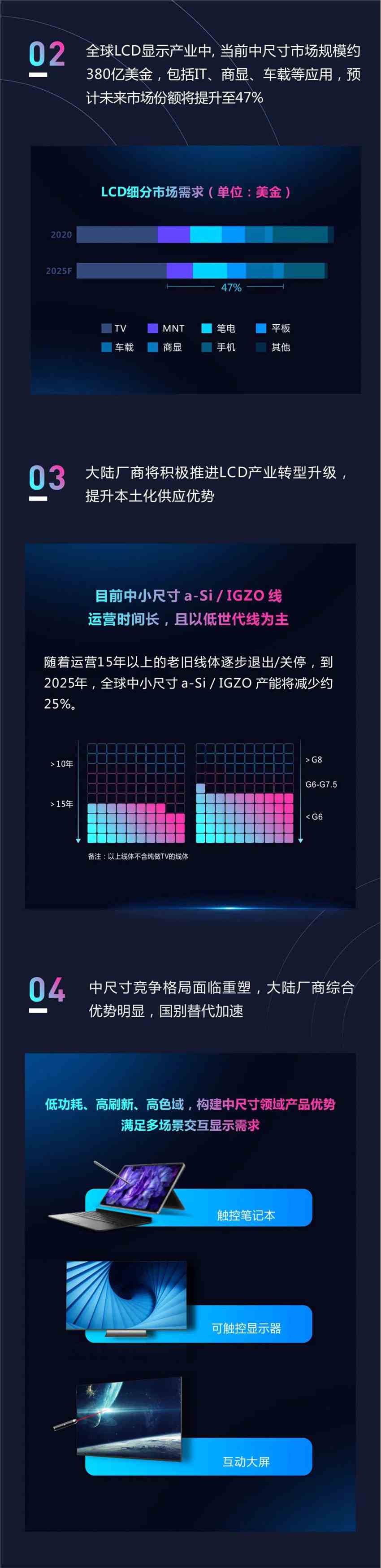 這是一條月加工2250mm×2600mm玻璃基板能力約18萬片的第8.6代氧化物半導(dǎo)體新型顯示器件生產(chǎn)線,主要生產(chǎn)和銷售中尺寸高附加值IT顯示屏(包括Monitor、Notebook、平板),車載顯示器,醫(yī)療、工控、航空等專業(yè)顯示器,商用顯示面板等。