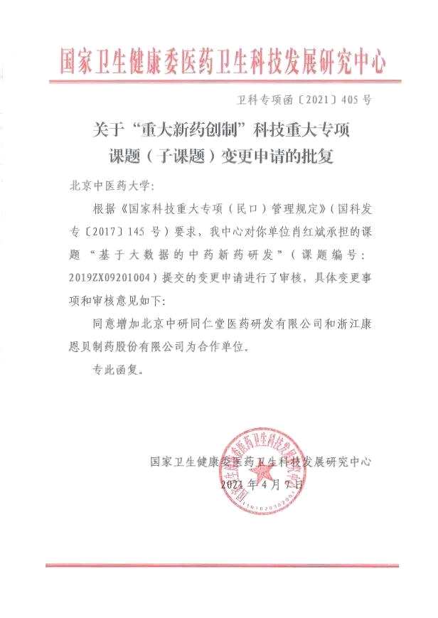 摘要: 4月7日,國家衛(wèi)生健康委醫(yī)藥衛(wèi)生科技發(fā)展研究中心批復(fù)北京中醫(yī)藥大學(xué)關(guān)于“重大新藥創(chuàng)制”科技重大專項(xiàng)課題――“基于大數(shù)據(jù)的中藥新藥研發(fā)”的變更申請,