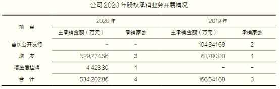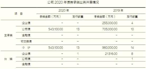 2020年,東北證券完成債券主承銷項(xiàng)目13個(gè),均為公司債,實(shí)際承銷規(guī)模54.31億元;完成債券分銷項(xiàng)目191個(gè),實(shí)際承銷規(guī)模254.00億元。