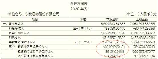 2020年,東北證券手續(xù)費(fèi)及傭金凈收入為19.48億元,其中經(jīng)紀(jì)業(yè)務(wù)手續(xù)費(fèi)凈收入10.21億元,投資銀行業(yè)務(wù)手續(xù)費(fèi)凈收入2.81億元,資產(chǎn)管理業(yè)務(wù)手續(xù)費(fèi)凈收入1.54億元。