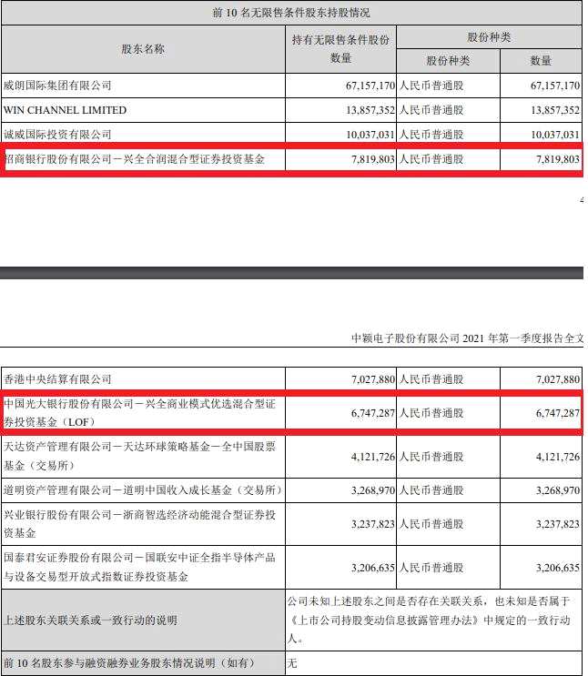 4月12日,【中穎電子(300327)、股吧】(300327)披露的一季報(bào)顯示,謝治宇所管的興全合潤(rùn)基金在一季度買入781.98萬(wàn)股中穎電子,按照一季度平均成交價(jià)計(jì)算,買入金額約達(dá)3.05億元,新進(jìn)公司第四大流通股東。與謝治宇一同買入中穎電子的還有興全基金另外一位基金經(jīng)理――喬遷,喬遷所管的興全商業(yè)模式基金一季度末持有中穎電子674.73萬(wàn)股,新進(jìn)中穎電子第六大流通股東,而從2020年年報(bào)看,上述兩只基金去年年末均未持有中穎電子。