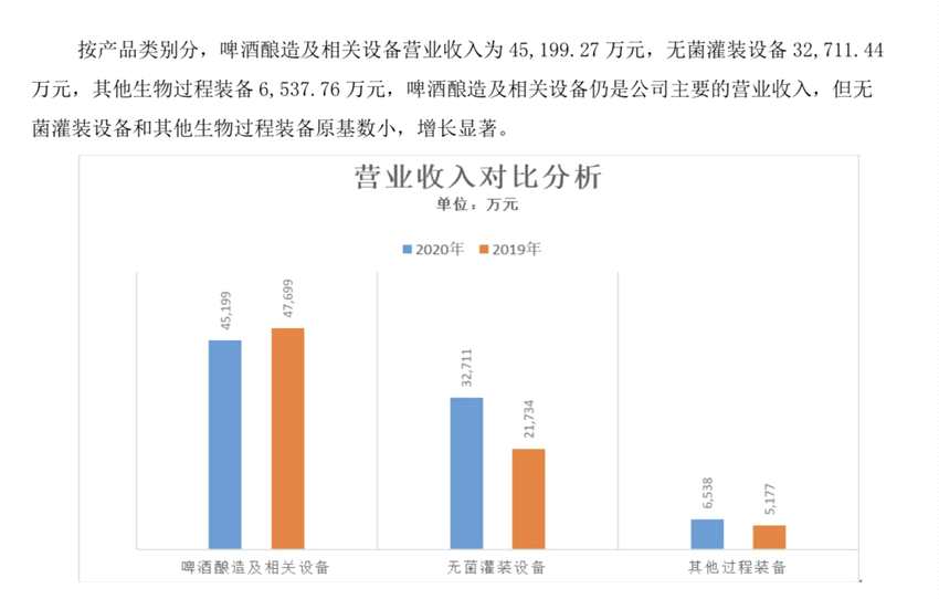 按產(chǎn)品類別分,啤酒釀造及相關(guān)設(shè)備營業(yè)收入為4.52億元,無菌灌裝設(shè)備3.27億元,其他生物工程裝備6537.76萬元,啤酒釀造及相關(guān)設(shè)備仍是公司主要的營業(yè)收入,但無菌灌裝設(shè)備和其他生物工程裝備原基數(shù)小,增長顯著。