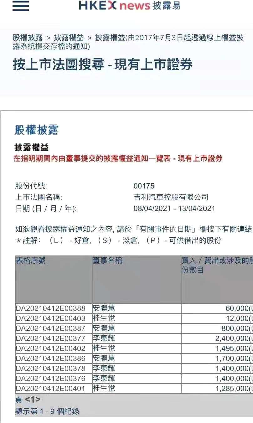 4月17日,記者從港交所公告獲悉,吉利控股集團(tuán)三位高管――吉利控股集團(tuán)CEO李東輝、吉利控股集團(tuán)總裁、吉利汽車(chē)集團(tuán)董事長(zhǎng)、極氪CEO安聰慧安聰慧、吉利汽車(chē)執(zhí)行董事兼行政總裁桂生悅于4月8日、9日、12日三天分別斥資4963.5萬(wàn)、5304.5萬(wàn)和5773.3萬(wàn)港幣增持(累計(jì)超1.51億港元)吉利汽車(chē)240萬(wàn)股、256萬(wàn)股和279.2萬(wàn)股。