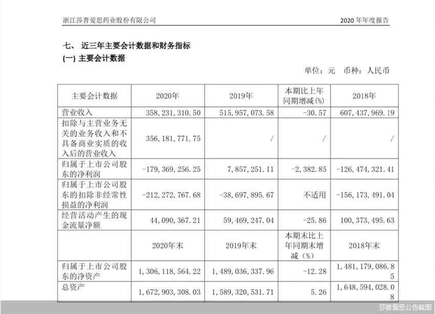 根據(jù)年報(bào),莎普愛思實(shí)現(xiàn)營(yíng)收3.58億元,較2019年同期減少1.58億元,同比下降30.57%;虧損1.79億元,上年同期盈利785.73萬(wàn)元。
