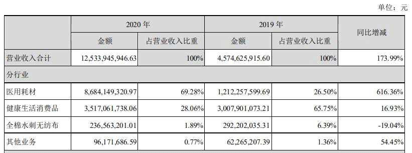 分行業(yè)來(lái)看,2020年,公司醫(yī)用耗材業(yè)務(wù)實(shí)現(xiàn)營(yíng)業(yè)收入86.84億元,同比增長(zhǎng)616.36%;健康生活消費(fèi)品業(yè)務(wù)實(shí)現(xiàn)銷(xiāo)售收入35.17億元,同比增長(zhǎng)16.93%,其中全棉時(shí)代銷(xiāo)售收入34.77億元,同比增長(zhǎng)15.80%;津梁生活銷(xiāo)售收入0.40億元;全棉水刺無(wú)紡布收入2.37億元,同比下降19.04%。