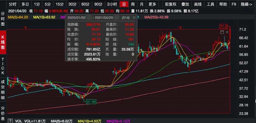 妙可藍(lán)多是中國4000多家上市公司當(dāng)中唯一一家以奶酪為核心業(yè)務(wù)的企業(yè)。去年年初,妙可藍(lán)多股價還不足15元,此后股價一路攀升,自去年年初以來,股價已經(jīng)累計漲近390%。