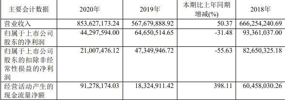 報告期內(nèi),公司營業(yè)收入實現(xiàn)8.54億元,同比增長50.37%;歸屬于上市公司股東的凈利潤4429.76萬元,同比下降31.48%;歸屬于上市公司股東的扣除非經(jīng)常性損益的凈利潤2100.75萬元,同比下降55.63%;經(jīng)營活動產(chǎn)生的現(xiàn)金流量凈額9127.82萬元,同比增長398.11%。