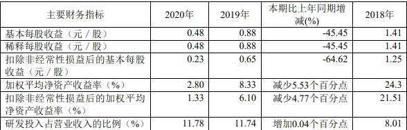2020年,公司加權(quán)平均凈資產(chǎn)收益率為2.80%,同比減少5.53個百分點;扣除非經(jīng)常性損益后的加權(quán)平均凈資產(chǎn)收益率為1.33%,同比減少4.77個百分點。