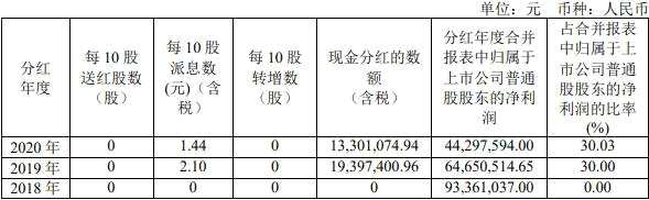 2020年度公司經(jīng)營業(yè)績實現(xiàn)盈利,在充分考慮公司盈利情況、所處行業(yè)特點以及未來資金需求等因素的前提下,為回饋投資者,公司擬定了2020年度的利潤分配預(yù)案。公司擬向全體股東每10股派發(fā)現(xiàn)金紅利1.44 元(含稅)。截至2020年12月31日,公司總股本 9236.86萬股(92368576股),以此計算合計擬派發(fā)現(xiàn)金紅利1330.11萬元(13301074.94元)(含稅)。本年度公司現(xiàn)金分紅金額占本公司2020年度合并報表歸屬于上市公司股東凈利潤的30.03%。本年度公司不送紅股、不進(jìn)行資本公積轉(zhuǎn)贈股本,剩余未分配利潤暫不分配。若本次利潤分配方案實施完畢前,公司總股本發(fā)生變化,公司將按照“分配總金額不變”的原則對每股分紅比例和金額進(jìn)行相應(yīng)調(diào)整。