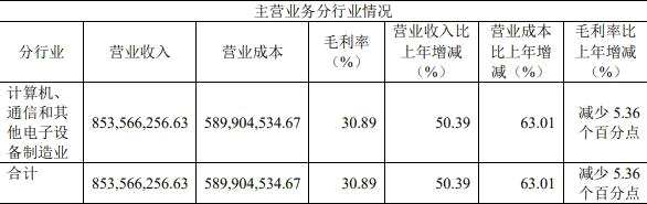 公司主營業(yè)務(wù)行業(yè)為計算機(jī)、通信和其他電子設(shè)備制造業(yè)。報告期內(nèi),主營業(yè)務(wù)毛利率30.89%,同比減少5.36個百分點。