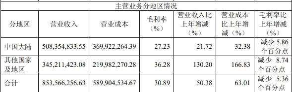 公司業(yè)務(wù)分為中國大陸、其他國家及地區(qū)兩個板塊。報告期內(nèi),中國大陸營收實現(xiàn)5.08億元,同比增長21.72%,毛利率27.23%,同比減少5.86個百分點;其他國家及地區(qū)營收實現(xiàn)3.45億元,同比增長130.20%,毛利率36.28%,同比減少8.74個百分點。